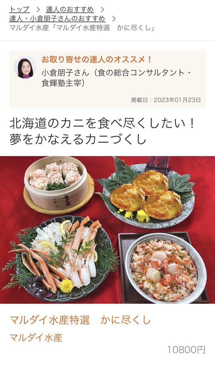 情報サイト おとりよせネット 達人 #小倉朋子 さんのおすすめになんと、特選 かに尽くしが紹介されました♪ありがとうございます😭北海道のカニを食べ尽くしたい!夢をかなえるカニづくし🦀