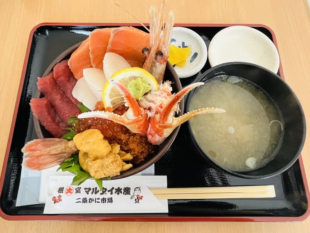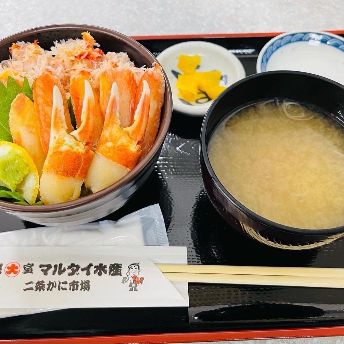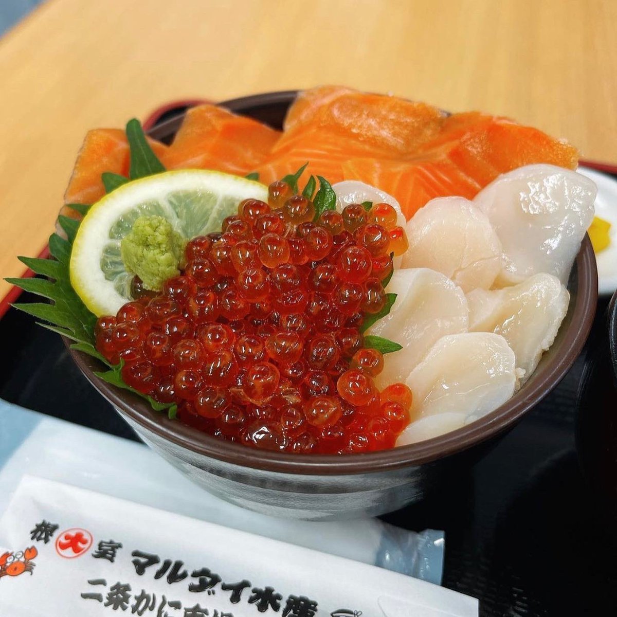 3月なかばになり、最近の二条市場は卒業旅行などで、北海道を楽しんでいるお客様がたくさん❗️マルダイ水産では、お客様がお好きなネタ3品選ぶお好み三色丼もあり大人気🦀